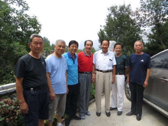 到了回龙天界山景区大门前,才知道还有一关,买票通关,经过了特别通行证,就是军退军残70以上老人办理手续,又买了小交通票,正式登车上山。仰望天空,太行巍巍而立,9公里山路,没有车还真是不行,辗转拐弯,看群雕,经挂壁石头路,经过老爷顶,游人都下车了,我们又前行了两三公里,老连长说了一声,桥头到了。就看到车窗边出现了一个笑嘻嘻的面孔,这不是杨治安么?我们紧忙下车,跟着他往临时军营,一个农家乐走去。